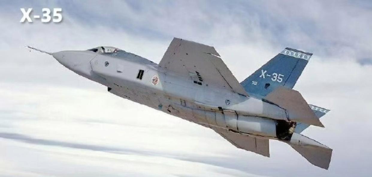 从下图可以看出,F-35的原型机——X-35战机,和现在的F-35很不一样,其机腹非常平。